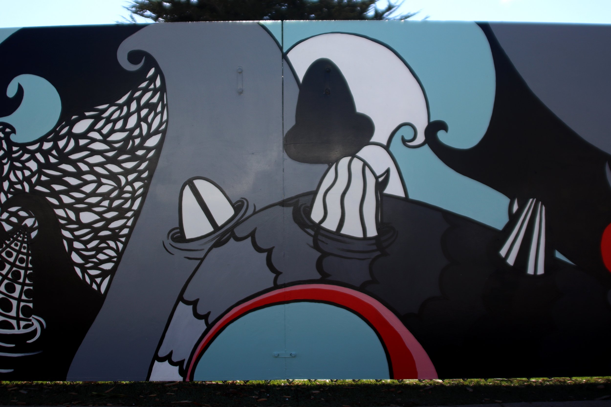 …this mural was created and designed as a csumb capstone project and gifted to the marina skatepark on october 26th, 2013. ten years later a restoration project was established. with co-painter megan goodwin this restoration was completed march 2023. special thanks to marina youth arts for underwriting and funding the project, and a big thank you to the students from the marina youth arts’ los arboles after school arts program who assisted in the painting of the mural, 2023, located: (304 hillcrest ave, marina, ca 93933)…
